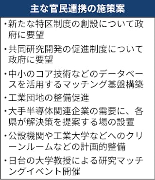 半導体産業に関連した連携の中心となる拠点整備については、用地の整備に関する規制緩和や進出企業に対する税制支援などができるよう、新たな特区制度の創設を要望項目として検討する。企業主導型の産学共同研究への財政支援や兼業規制の緩和など、産学連携による共同研究開発の促進に関する仕組み作りなども要望する考えだ。