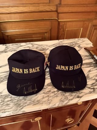 「JAPAN IS BACK」は首相が自民党総裁選にあたり、討論会などで繰り返したキャッチフレーズだ。トランプ氏がよくかぶる自身のスローガン「Make America Great Again(米国を再び偉大に)」を書いた赤い帽子を模した。首相の側近が助言し準備した。