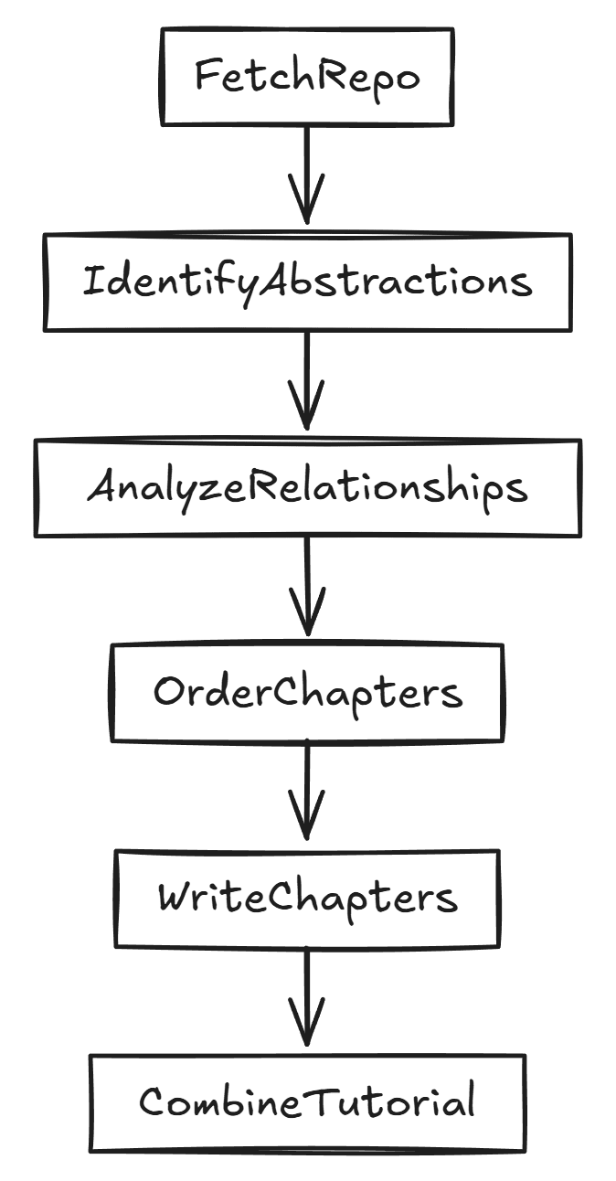 flow.run(shared)Here's where the magic happens! Just look at those >> operators connecting everything together. It's like reading a story: fetch the repo, identify key concepts, analyze their relationships, figure out teaching order, write chapters, combine everything. Then we create the flow and run it with a GitHub URL. That's it!