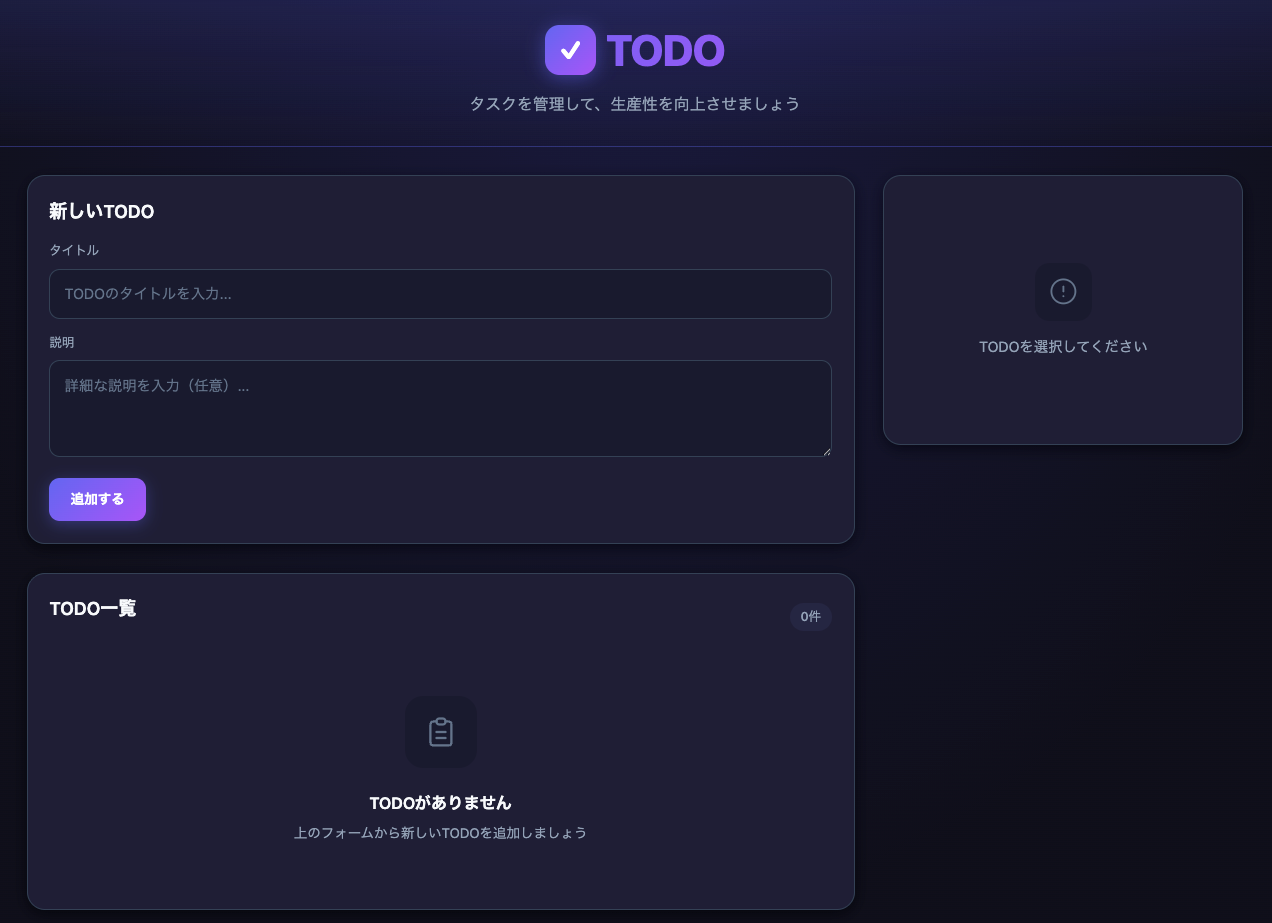 シンプルな Next.js TODO アプリがすでに動作している状態を想定する。基本機能(タスクの追加・編集・削除・完了)は実装済みだ。まるで私が実装したかのように述べたが、Opus 4.5 で作成している。彼奴の戦闘力は530000である。