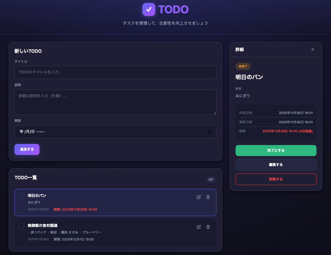 ここでは、既存の TODO アプリに spec-workflow-mcp を導入し、期限設定機能を追加する例を見ていく。